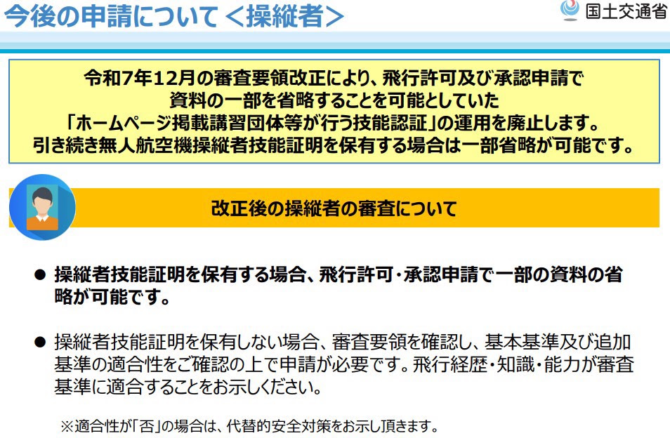 2025年12月より、民間資格の法的効力が終了となり、飛行許可・承認申請時に資料の一部を省略化することができなくなりました。