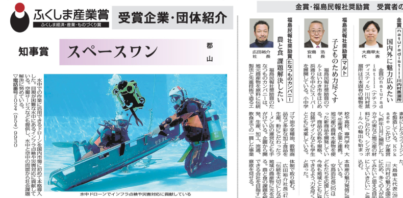 この度は、名誉ある福島県知事賞をいただき大変光栄に存じます。水中ドローン業界の市場拡大・創出に尽力し、また福島発の企業として、地域のインフラを支え産業を盛り上げたいという一心で取り組んでまいりました。