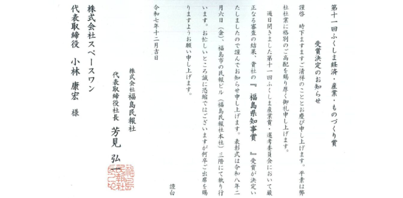 この度、福島ドローンスクールを運営する株式会社スペースワンが、福島民報社主催の「第11回ふくしま産業賞」において、最高賞にあたる「福島県知事賞」を受賞いたしました!