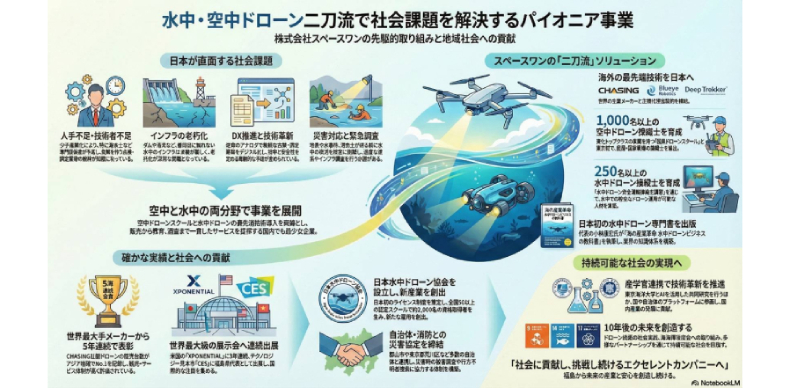 株式会社スペースワンは、「水中・空中ドローン二刀流」を掲げ、以下の取り組みが評価されました。