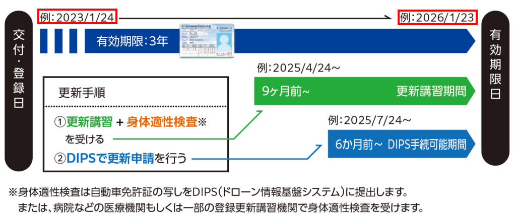 更新申請は技能証明の有効期限日より6ヶ月前から手続き可能となり、期限日の1ヶ月前までに行う必要があります。※DIPS(ドローン情報基盤システム)で手続き可